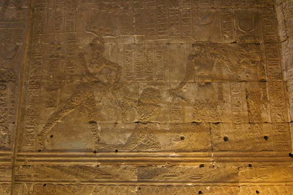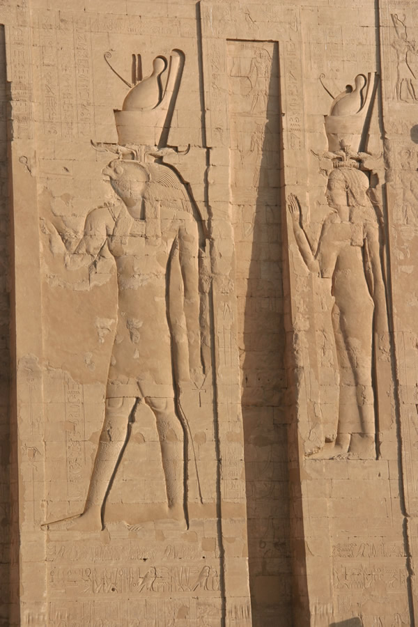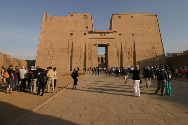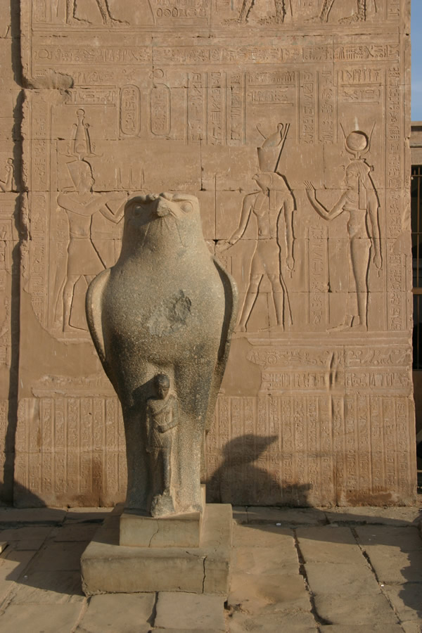 Der Horus-Tempel besitzt mit einer Länge von 137 m und einer Höhe von 79 m gewaltige Ausmaße. Rechts und links des Einganges stehen zwei beeindruckende aus schwarzem Granit gefertigte Falken. Diese Statuen stellen den Gott Horus dar, der in ägyptischer Sprache "hr" genannt wurde, was wiederum Falke bedeutet. Nach überlieferten Sagen war der Gott Horus ein großer Kämpfer, der in Edfu einen seiner größten Siege errang. Die Tempelanlage in Edfu wurde ihm zu Ehren erbaut. Direkt neben dem Horustempel sind die Überreste einer antiken Stadt zu sehen mit Häusern aus der byzantinischen, der griechischen und der römischen Zeit.